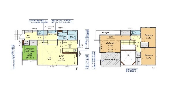 | 設備 | 個別LPG、公営水道、公共下水、駐車場2台以上、緑豊かな住宅地、閑静な住宅地、南側道路面す、スーパーが近い(10分以内)、2沿線以上利用可、小学校徒歩10分以内、中学校徒歩10分以内、公園5分以内、システムキッチン、I型キッチン、ユニットバス、追い焚き、ウォシュレット、トイレ2ヶ所、浴室に窓、暖房便座、バルコニー、2階建、LDK20畳以上、採光2面、フローリング、リビング階段、クローゼット、収納、床下収納、下駄箱、全居室収納、シャンプドレッサー付き、フラット35Sに対応、モニタ付きインターフォン、インターフォン、24時間換気システム、建物10年保証 |